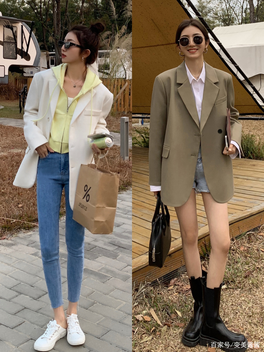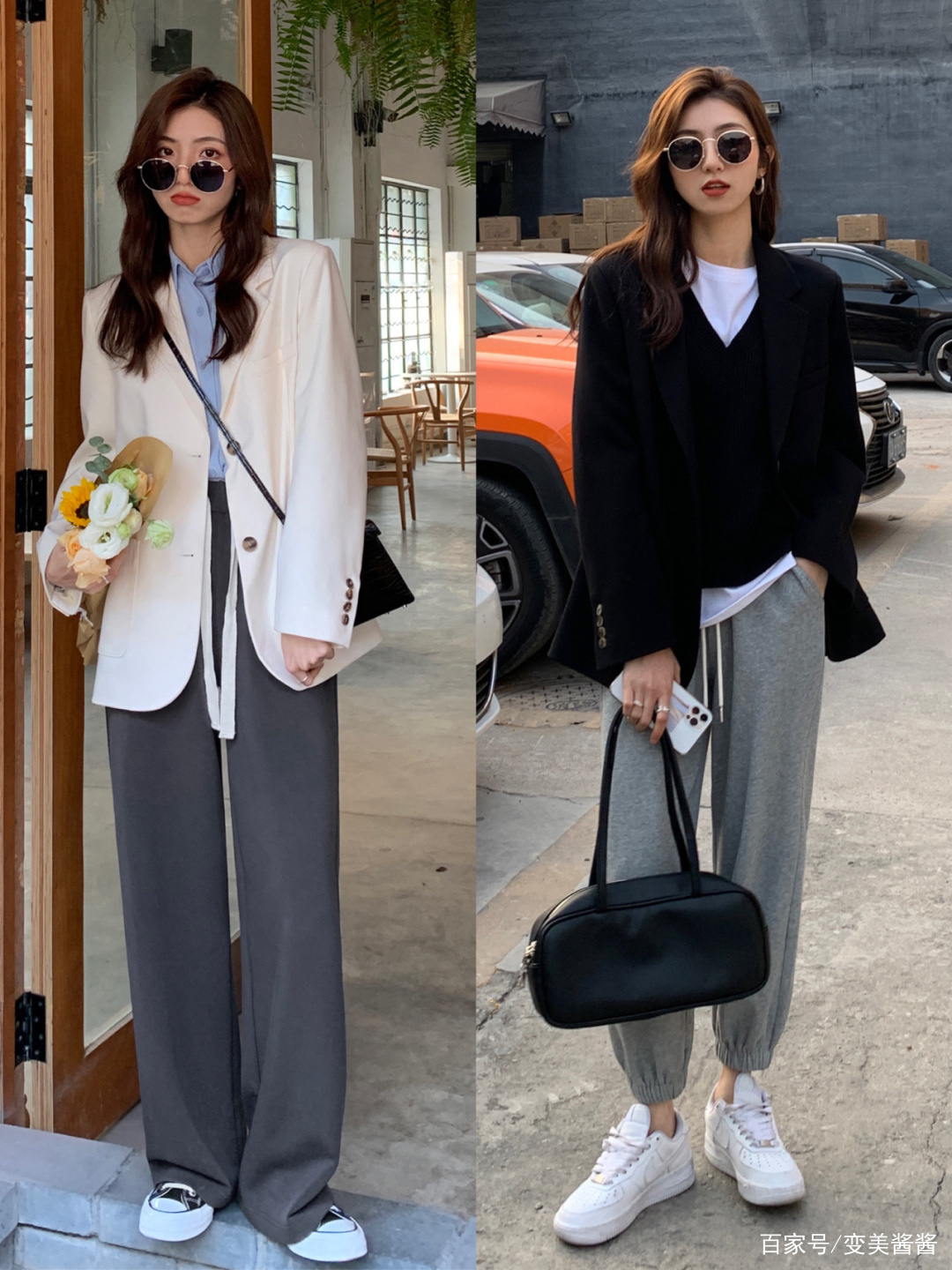 在近两年来的西装穿搭中,我们很少会看见西装+西装裤的搭配,各路时尚达人解锁了很多新穿法。就像这组穿搭,我们先来看到左图搭配,所选择的是一款纯白色的西装外套,版型挺阔,款式简约,穿起来显得清爽又干练,内搭一件浅蓝色的衬衫,优雅清新。下半身则选择了一条宽松的灰色阔腿长裤,与上半身的风格截然不同,更能碰撞出时尚火花。黑色的西装外套穿起来更加干练利落,里面搭配一件黑色的V领针织衫,再叠穿一件白色的打底衫,黑色与白色的搭配简约又大气,三件叠穿又能够打造丰富的层次感。下半身搭配一条束腿的浅灰色运动裤与白色运动鞋,时尚感倍增。