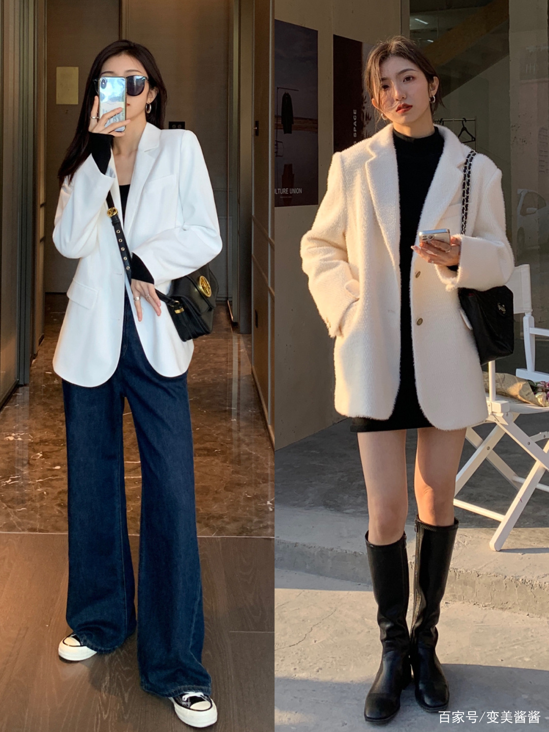比起纯黑色的西装外套,纯白色的西装看起来更加清爽一些,内搭一件黑色打底,又多了几分沉稳的感觉。下半身搭配一条深蓝色的高腰阔腿拖地裤,时髦又大气。在右图的穿搭中,所穿的也是一件白色西装外套,但是属于毛绒的面料更加厚实,内搭黑色短裙,配上黑色长筒靴,整套穿搭看起来性感又时尚。